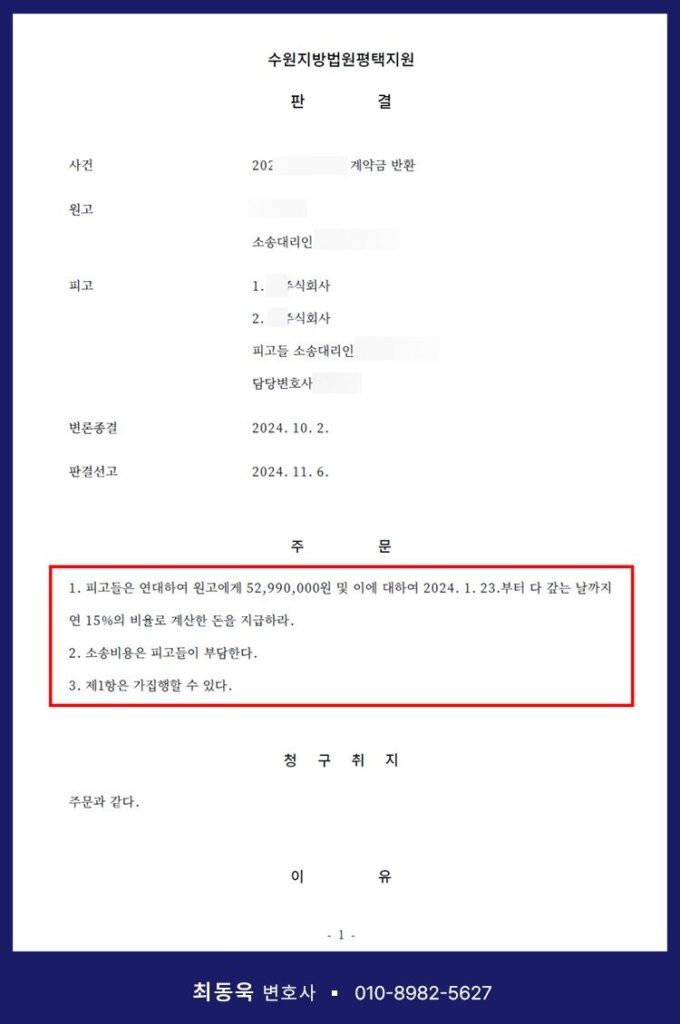 최동욱 변호사는 수많은 분양계약 분쟁을 다뤄 온 실전 경험과, 대형로펌(법무법인 세종)에서의 탄탄한 실무 경력을 바탕으로, 단순한 법률 대응을 넘어 실질적인 회수를 위한 전략을 제공해 드리고 있습니다. 보다 구체적인 상담이 필요하시다면, 아래 연락처로 언제든지 문의 주시기 바랍니다.