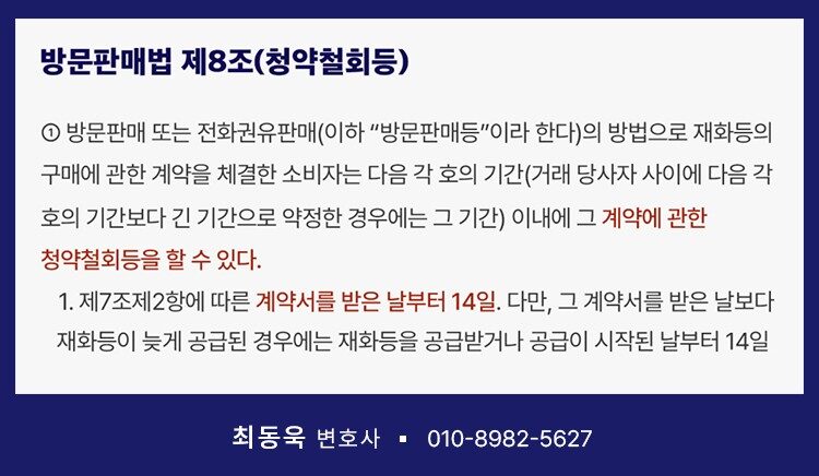 방문판매법상 청약철회란, 방문판매법 제8조에서 규정한 소비자의 핵심적 보호장치입니다. 동 조항은 “소비자는 계약서를 교부받은 날부터 14일 이내에는 청약을 철회할 수 있으며, 이로 인해 위약금이나 손해배상을 청구당하지 않는다”고 명시하고 있습니다. 즉 방문판매, 전화권유판매, 다단계판매 등의 방식으로 계약이 체결된 경우, 소비자는 단순한 변심만으로도 자유롭게 청약을 철회할 수 있는 권리를 가지게 됩니다.