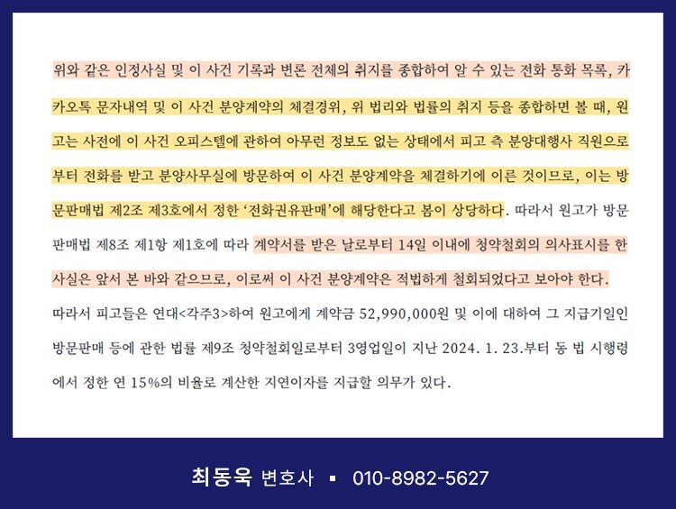 실제로 여러 법원은 특정 분양계약이 방문판매의 형태에 해당한다고 판단되는 경우, 수분양자가 법정 기간 내에 청약철회를 행사하였다면 그 효력을 인정해야 한다는 취지의 판결을 선고해 왔습니다. 아래 판결문에서도 확인할 수 있듯이, 법원은 해당 권리를 매우 폭넓게 해석하며 수분양자를 보호하고 있습니다.