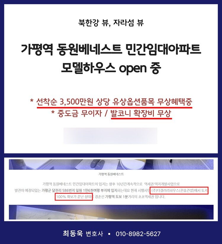 최근 토지 확보나 인허가 절차가 제대로 이루어지지 않은 상태에서 ‘10년 임대 후 분양전환’을 내세워 계약자를 모집하는 민간임대아파트 사업들이 잇따라 논란이 되고 있습니다. 이에 최동욱 변호사는 피해를 호소하시는 가입자분들을 위해 지속적으로 법률적 조력을 제공해 드리고 있는데, 오늘은 그 사례 중 하나로 경기도 가평군 가평읍 달전리 586번지 일원에서 추진 중인 ‘가평역 동원베네스트’ 민간임대아파트를 살펴보고자 합니다.