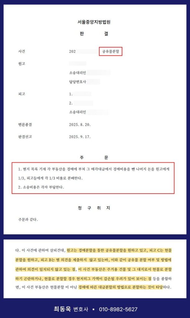 결국 법원은 경매를 통해 매각한 뒤 그 대금을 지분 비율대로 나누는 것이 가장 합리적이라고 판단하여, 원고의 청구를 인용하였습니다.