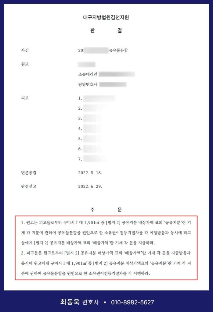 결국 사건을 심리한 대구지방법원은 원고의 주장을 받아들여, 해당 토지를 원고가 단독으로 취득하고 피고들은 각자의 지분에 해당하는 금액을 지급받는 방식, 즉 ‘가격(가액) 배상에 의한 분할’을 선고하였습니다.