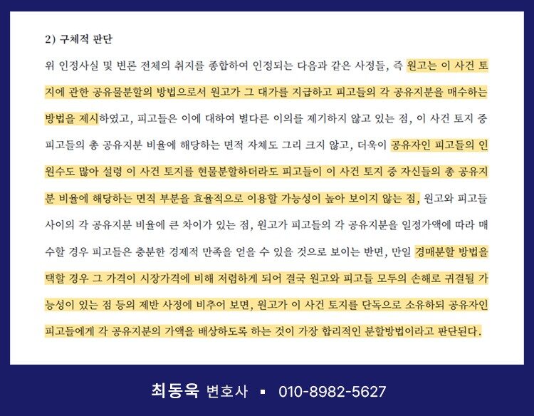 또한 원고가 해당 부지를 전부 인수하겠다는 명확한 의사를 밝히고 있는 반면, 경매로 진행될 경우 시세보다 낮은 가격에 매각되어 오히려 모든 공유자가 손해를 볼 가능성도 중요한 판단 요소로 작용했습니다.