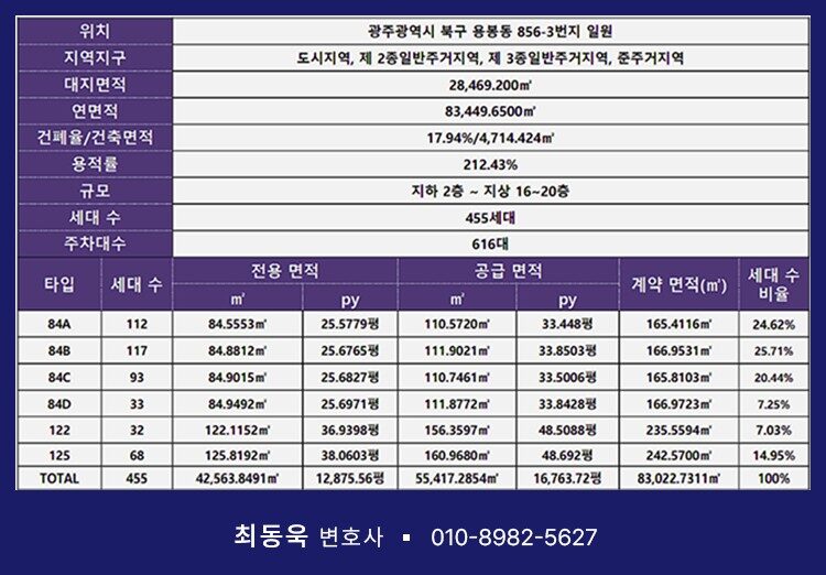 광주광역시 북구 용봉동 856-3번지 일원에서 ‘용봉 중흥S클래스 비엔날레’ 아파트 건립을 목표로 추진된 용봉 지역주택조합은 2023년 조합설립인가를 받았으나, 이후 사업이 사실상 정체된 상태로 알려져 있습니다. 이로 인해 최근 다수의 조합원분들께서 저희 법무법인에 법률 상담을 의뢰하고 계신 사업장 중 하나입니다.
