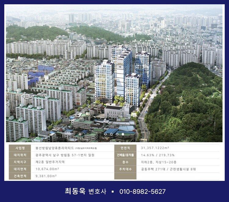 이번 글에서는 그중에서도 광주광역시 남구 방림동 57-1번지 일원에서 ‘봉선방림 남양휴튼 리미티드’라는 명칭으로 아파트 건립을 추진하며 설립된 남주 지역주택조합과 관련하여 주요 검토 사항을 살펴보고자 합니다. 지역주택조합 사업은 그 구조적 특성상 사업 지연 또는 무산의 위험이 상존하는 고위험 사업에 해당합니다.