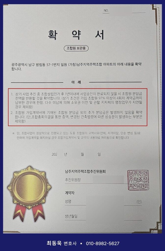 “본 사업 추진 과정에서 조합설립인가 후 1년 이내에 사업승인이 완료되지 않을 경우, 조합원 분담금 전액을 반환할 것을 확약합니다.”