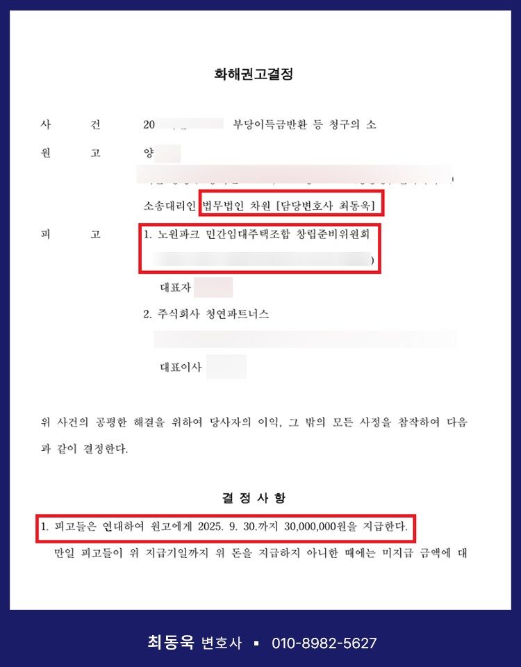 이에 최동욱 변호사는 의뢰인을 대리해 해당 문서의 위법성과 사업 주체의 기망행위를 근거로 계약 취소 및 납입금 반환 소송을 제기하였고, 서울북부지방법원은 최동욱 변호사의 주장을 받아들여 사업주체인 노원파크 민간임대주택조합 창립위원회가 의뢰인들에게 계약금 전액을 반환하라는 내용의 화해권고결정을 내렸습니다.