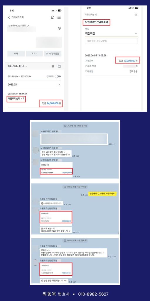 이번 사건의 의뢰인 두 분은 2024년 1월, ‘노원스타파크리움’ 민간임대아파트 1세대 공급계약을 체결하며 각각 계약금 3,400만 원과 5,000만 원을 납부하셨습니다.