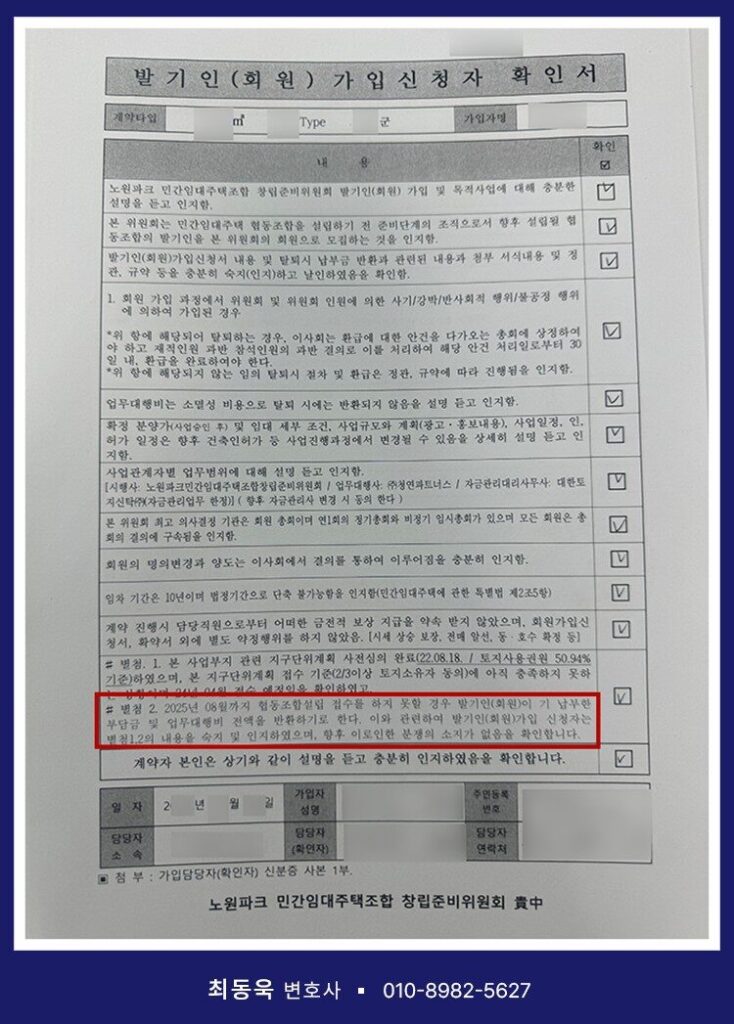 당시 사업 주체 측은 “2025년 8월까지 협동조합설립 신청을 완료하지 못할 경우, 납부한 조합원 부담금 및 업무대행비를 전액 반환한다”는 내용이 기재된 <발기인 가입신청자 확인서>를 교부하며 계약을 유도했습니다. 그러나 이 문서는 총회 결의 없이 발급된 일방적 환불보장 문서로, 실제로는 다수의 법원에서 위법·무효로 판단된 ‘안심보장증서’와 동일한 유형에 해당합니다.