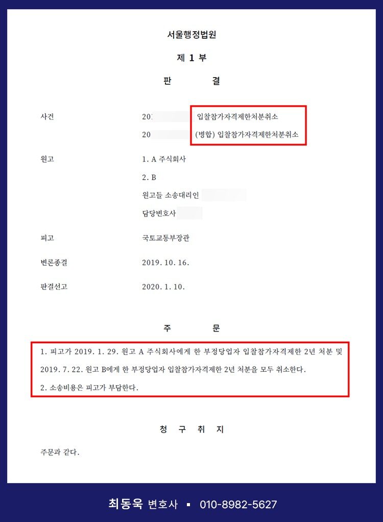이에 따라 서울행정법원은 국토교통부의 2년 입찰참가자격 제한처분은 위법하므로 이를 취소하라는 원고 승소 판결을 선고하였습니다.