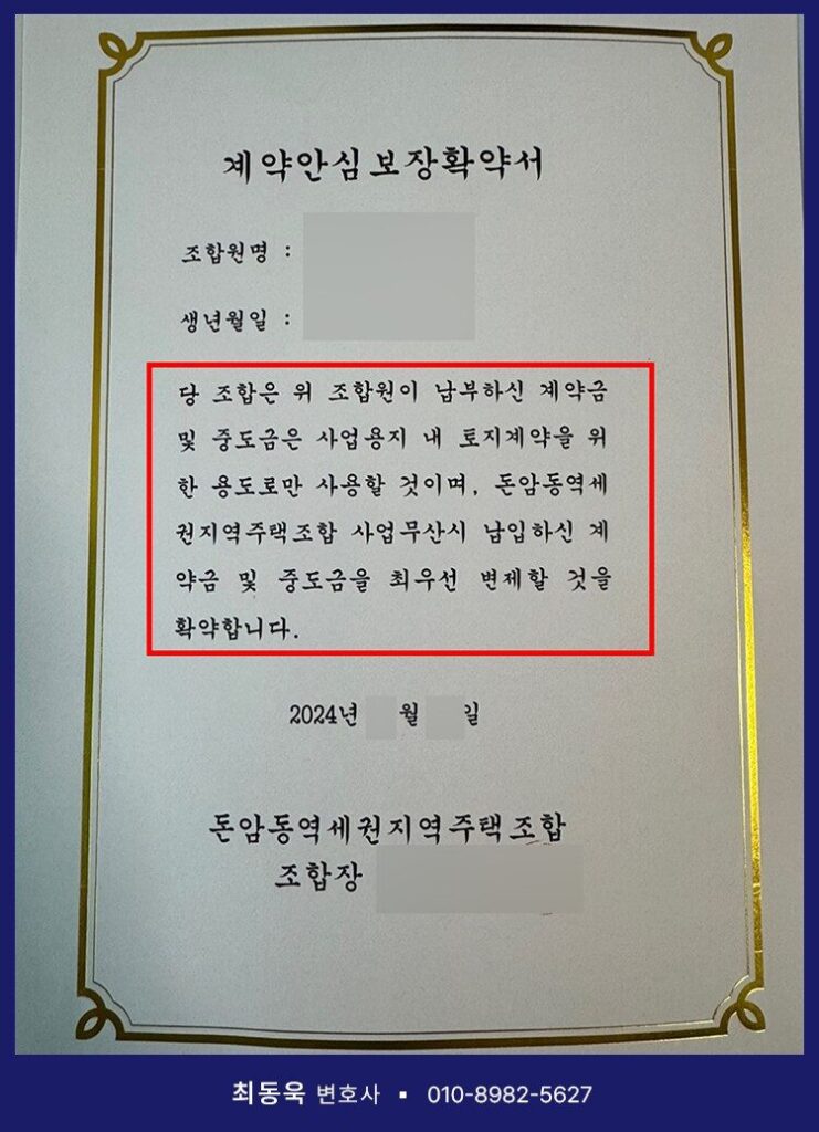 그러나 사업이 진행되는 과정에서 조합 운영 전반에 대한 신뢰를 상실하게 된 의뢰인께서는 최동욱 변호사를 통해 계약서 및 관련 서류에 대한 법률검토를 진행하셨고, 그 과정에서 계약 체결 당시 교부받은 이른바 계약안심보장확약서에 중대한 법적 하자가 존재한다는 점을 확인하게 되었습니다.