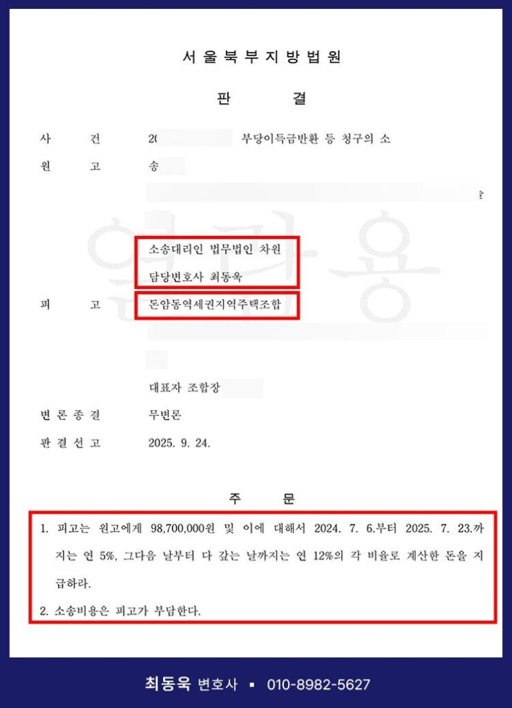 그 결과 서울북부지방법원은 돈암동역세권 지역주택조합이 의뢰인에게 납입금 전액과 지연이자를 반환하라는 전액승소 판결을 선고하였습니다.