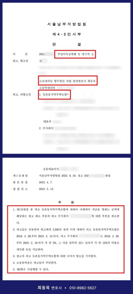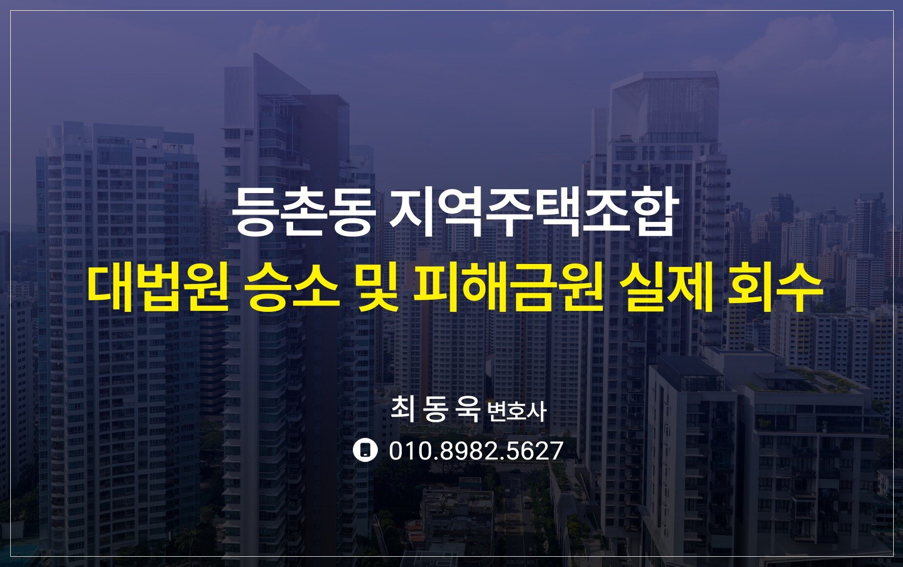 이에 본 글에서는 최동욱 변호사가 서울시에 소재한 등촌동 지역주택조합을 상대로 대법원에서 최종 승소한 이후 실제로 피해금 약 1억 원을 회수한 사례가 있어, 해당 성공사례에 대해 설명해 드리고자 합니다.