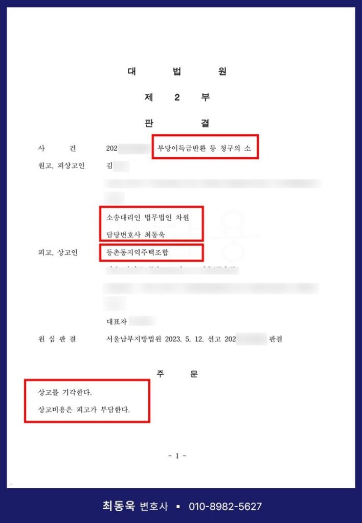 이에 최동욱 변호사는 해당 환불보장증서를 비롯한 조합 측의 위법한 행위들을 적극적으로 입증하고 주장하였습니다. 그 결과 조합 측이 항소를 제기했음에도 불구하고 1심과 2심 모두 의뢰인의 청구를 인정하는 판결이 선고되었으며, 나아가 대법원에서도 최종적으로 등촌동 지역주택조합이 원고가 납부한 금액 전액과 이에 대한 지연이자를 반환해야 한다는 내용의 승소 판결이 확정되었습니다.