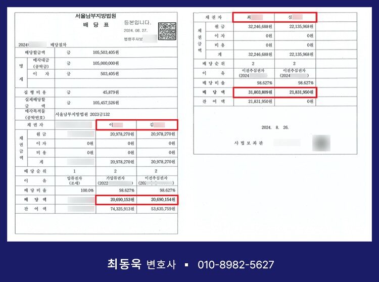 이후 최동욱 변호사는 확정된 승소 판결을 집행권원으로 삼아 조합의 재산을 대상으로 강제집행 절차를 진행하였습니다. 그 결과 2024년 8월 26일, 해당 의뢰인을 포함한 총 4명의 의뢰인께서 합계 약 1억 원의 피해 금액을 아래와 같이 실제로 회수하실 수 있게 되었습니다.