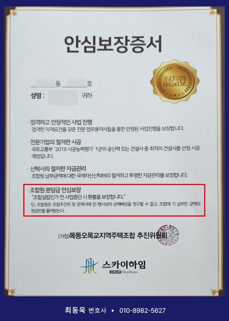 먼저 계약자들에게 교부된 이른바 「안심보장증서」의 내용을 살펴보겠습니다. 해당 문서에는 “조합설립인가 이전에 사업이 중단될 경우, 분담금 전액을 환불한다”는 취지의 내용이 기재되어 있습니다. 그러나 지역주택조합 사업의 구조상, 사업이 중단될 경우 조합 명의의 실질적인 재산이 남아 있지 않은 경우가 대부분이므로, 이러한 약정은 사실상 이행이 불가능한 내용을 담고 있다고 볼 수 있습니다. 오히려 사업이 중단되면 기존에 발생한 채무를 조합원들이 공동으로 부담해야 하는 구조이기 때문에, 위와 같은 문서는 계약자를 안심시키기 위한 사기에 준하는 내용의 문서라고 평가될 여지가 큽니다.