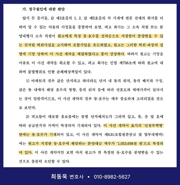 또, 스카이하임 사업은 계약 당시 특정 동·호수를 지정받아 분양을 받을 수 있는 것처럼 허위의 사실을 고지하여 가입계약 체결을 유도한 정황도 확인됩니다. 실제 계약서를 살펴보면, 계약자가 지정한 동·호수에 대응하는 분양대금이 특정되어 있는 등, 확정 분양이 가능한 것처럼 보이도록 작성된 부분이 다수 존재합니다. 그러나 지역주택조합 아파트는 관할 관청으로부터 사업계획승인을 받아야만 세대수 및 규모가 확정되므로, 계약 체결 시점에서는 동·호수를 특정하는 것 자체가 불가능한 구조입니다. 그럼에도 불구하고 마치 확정된 동·호수를 분양받을 수 있는 것처럼 기망하여 계약을 체결하게 한 것입니다.