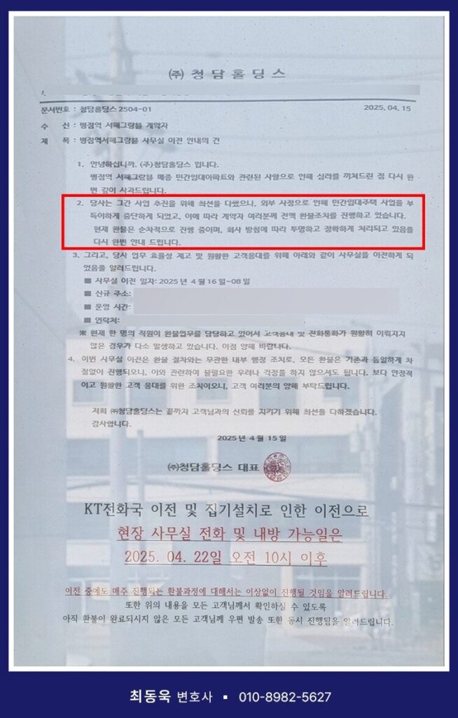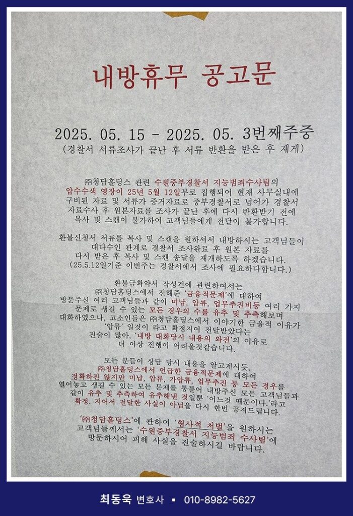 그러나 계약 체결 후 약 보름이 경과한 시점에서, 시행사인 ㈜청담홀딩스가 일방적으로 “사업이 취소되었다”는 안내와 함께 환불 신청을 받겠다고 고지하였고, 그 후 의뢰인을 비롯한 다수 계약자들의 환불 요청에 대한 처리를 반복적으로 지연하자, 결국 형사 고발이 이루어지면서 관련 사업 자료 일체가 수사기관에 의해 압수되는 상황에 이르렀습니다.