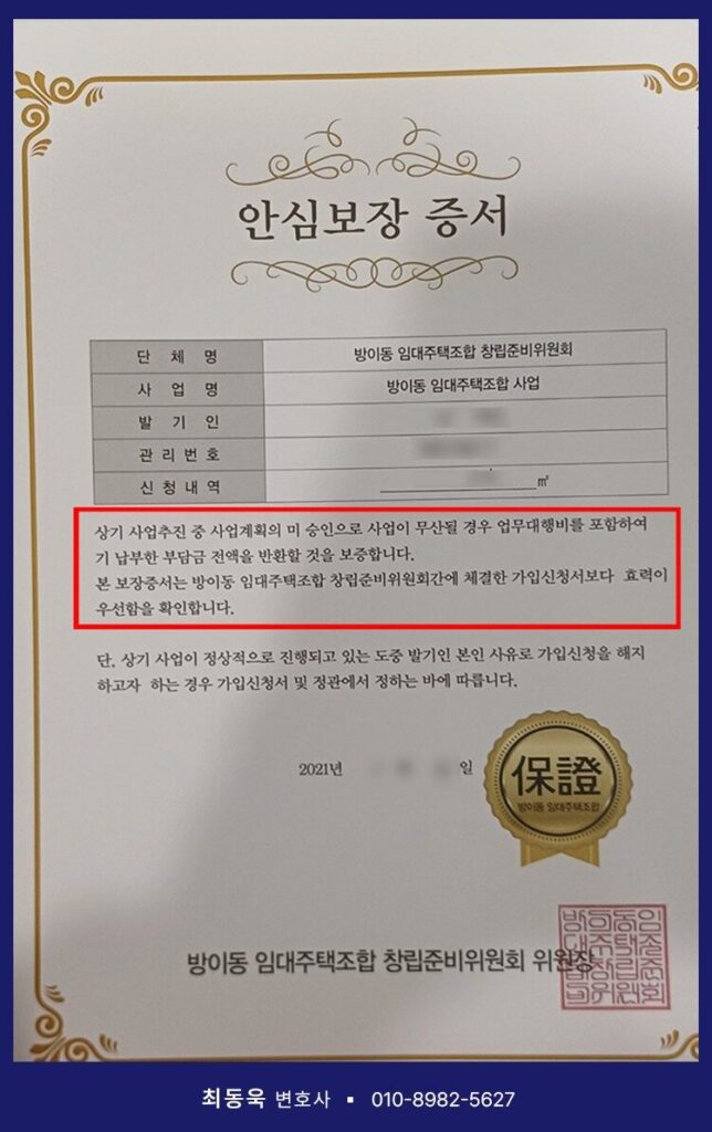 “사업계획이 승인되지 않아 사업이 무산될 경우, 업무대행비를 포함하여 기 납부한 부담금 전액을 반환할 것을 보증합니다”라는 문구가 기재된 이른바 ‘안심보장증서’를 교부한 것으로 확인되었습니다.