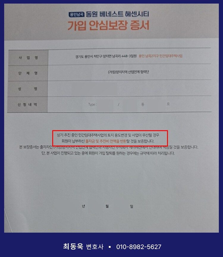 이와 관련하여 용인특례시 처인구 양지면 남곡2지구 일대에서 양지산업개발협력단이 추진 중인 용인남곡 동원 베네스트 헤센시티 민간임대아파트의 경우, 최동욱 변호사가 이미 다수의 의뢰인을 대리하여 계약취소 소송을 제기해 승소한 바 있으며, 최근에도 의뢰인 3명을 대리하여 추가 소송에서 승소 판결을 이끌어냈습니다.
