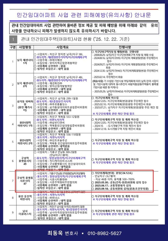 용인시 기흥구 언남동 일원에서시온주택정비주민협의회라는 임의단체가 주도하고 있는 ‘구성역 플랫폼 시온시티47’이라는 명칭으로 추진되고 있는 민간임대아파트 사업은 용인시가 공식적으로 ‘가입 주의가 필요한 민간임대아파트 현장’ 중 하나로 안내하고 있는 현장입니다.