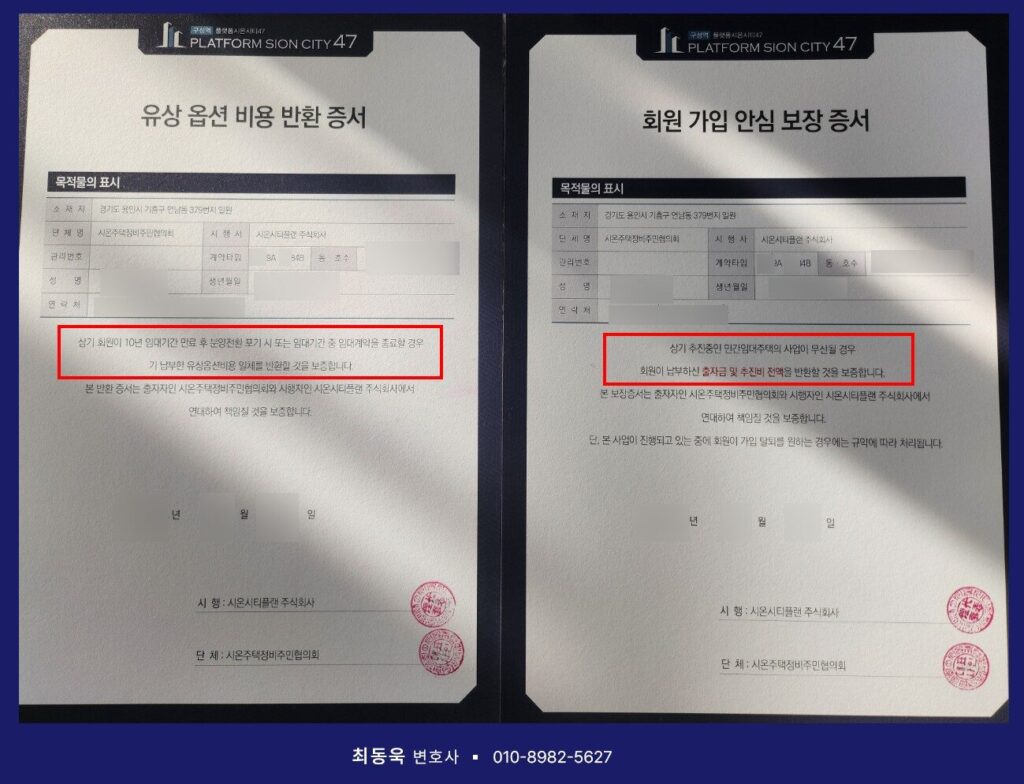 이와 관련하여 최근에도 다수의 계약자분들이 계약취소 가능성을 검토하기 위해 법률 상담을 진행하고 있으며, 상담 과정에서 공통적으로 확인되는 특징 중 하나는 ‘회원가입 안심보장증서’ 및 ‘유상 옵션 비용 반환 증서’와 같은 문서를 발급받았다는 점입니다. 표면적으로는 계약자 보호를 위한 장치처럼 보일 수 있으나, 이러한 문서들은 과거 다수의 지역주택조합에서 발급되어 문제된 이른바 ‘안심보장증서’와 동일한 구조를 가지고 있습니다.