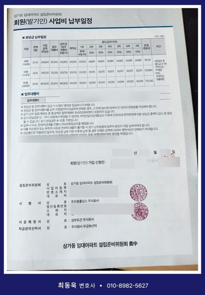 검토 과정에서 의뢰인께서는 계약 당시 “2023년 8월 26일까지 지구단위계획 접수를 약속하며, 이를 지키지 못해 회원(발기인) 가입 해지를 원하는 신청인에게는 업무대행비를 포함한 납부 분담금을 전액 반환한다”는 내용이 기재된 <확약서>를 교부받은 사실이 확인되었습니다.