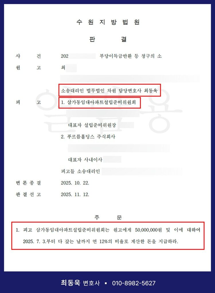 사건을 심리한 수원지방법원은 삼가동 임대아파트 설립준비위원회에 대해 의뢰인에게 납입한 5,000만 원 전액을 반환하라는 전액승소 판결을 아래와 같이 선고했습니다.