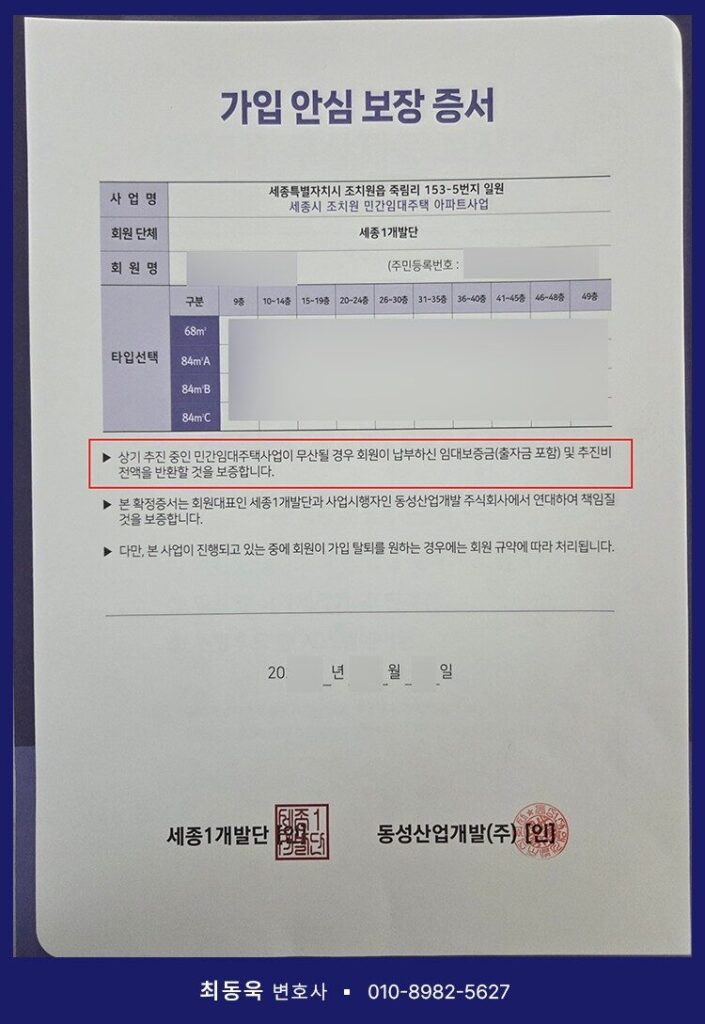 검토 결과, 해당 사업장은 계약 당시 일부 가입자들에게 “상기 추진 중인 민간임대주택사업이 무산될 경우 회원이 납부한 임대보증금(출자금 포함) 및 추진비 전액을 반환한다”는 취지의 ‘가입 안심보장증서’를 발급한 것으로 확인됩니다.