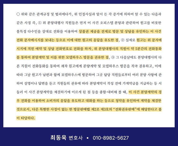 실제로 법원은 방문판매로 판단되는 민간임대아파트 계약의 경우, 기한 내 청약철회를 요구한 수분양자에게 청약철회권을 인정하는 판결을 다수 선고한 바 있습니다.