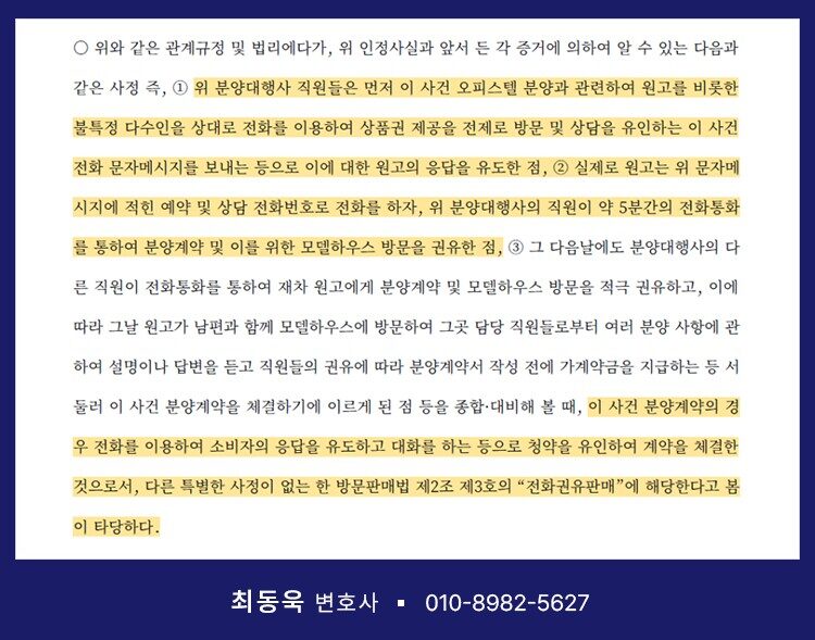전화권유에 따른 방문판매법 적용 오피스텔 분양계약해지 실제 사례