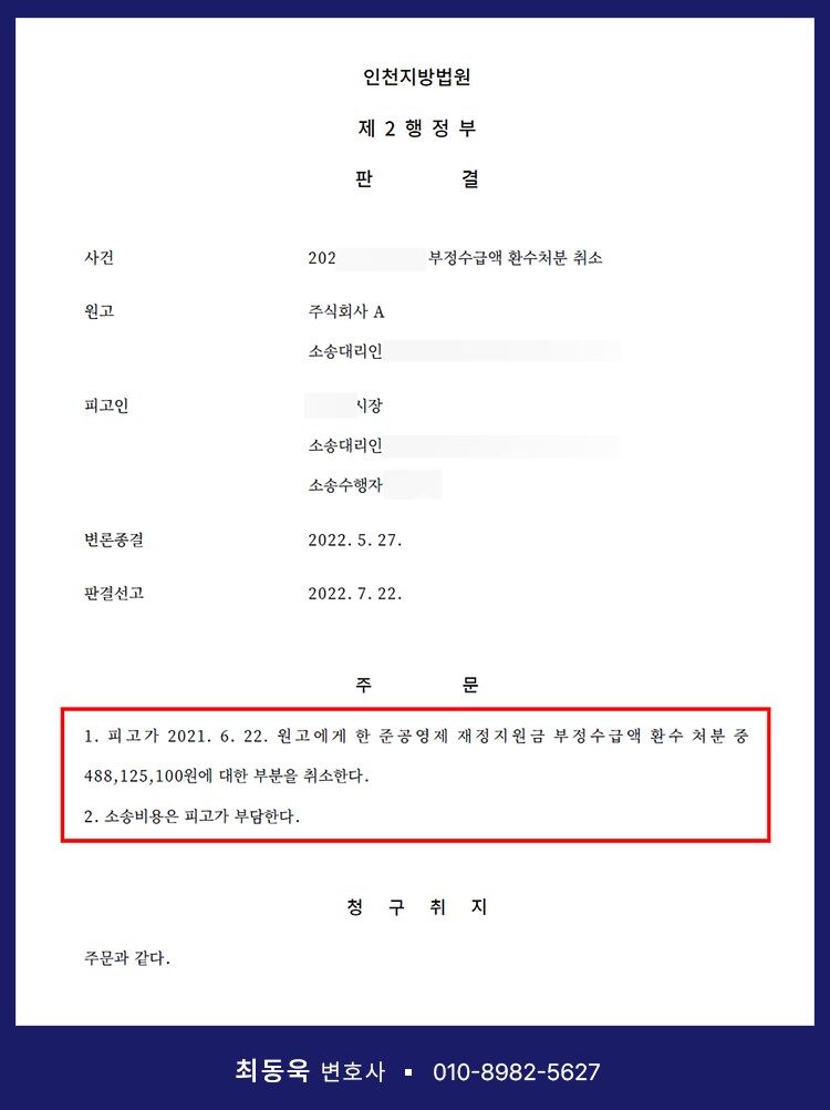 이와 같은 이유로 인천지방법원은 원고에게 부정수급 의도가 있었다고 보기 어렵다며, 인천시가 부과한 부정수급 환수 처분 중 488,125,100원에 해당하는 부분을 취소하라는 취지의 원고 승소 판결을 내렸습니다.