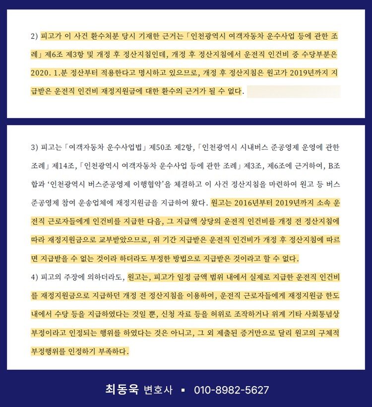이러한 예시로 인천시로부터 버스준공영제 재정지원금을 지원받은 한 버스회사가 보조금 부정수급 환수처분에 대하여 행정소송을 제기하여 해당 처분을 취소시킨 승소판결에 대해 설명해 드리겠습니다.