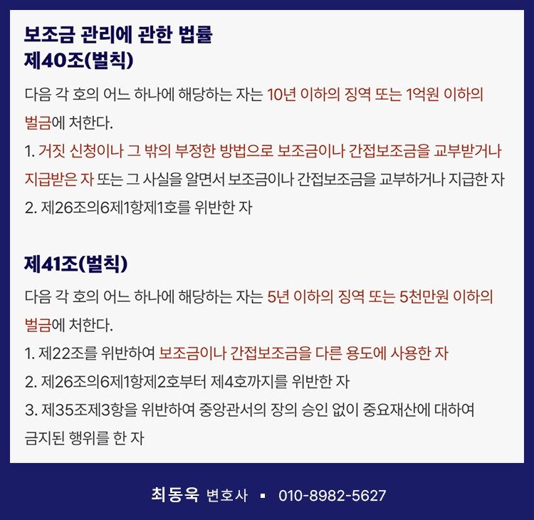 다만 이러한 보조금은 국민의 세금으로 마련되는 공적 자금이기 때문에, 부정한 방법으로 수급할 경우 매우 엄격한 제재를 받게 됩니다. 부정수급이 확인되면 지원금 전액을 환수당하는 것은 물론, 제재부과금 처분과 형사처벌까지도 이어질 수 있어 그 책임이 매우 무겁습니다. 따라서 관련된 의심이나 문제가 발생하는 경우에는 즉시 대응하고 적절한 조치를 취하는 것이 무엇보다 중요합니다.