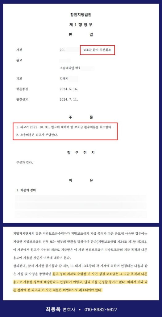 결국 사건을 심리한 창원지방법원은 이러한 점을 종합하여, 해당 보조금 환수 처분이 위법하다고 보고 이를 취소해야 한다는 원고 승소 판결을 선고하였습니다.