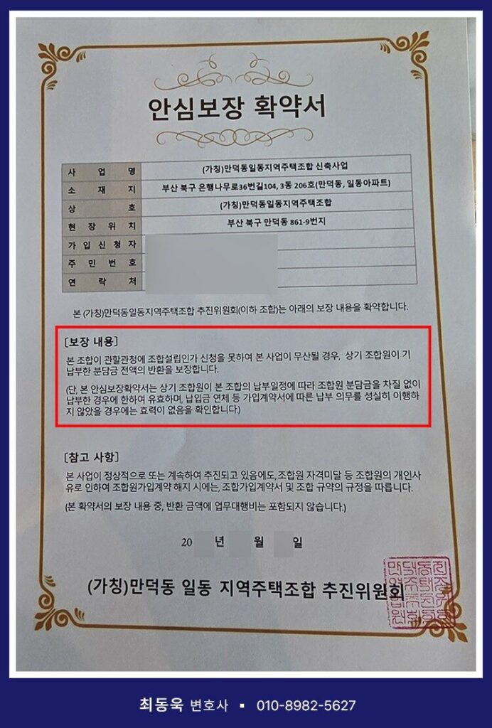 검토 결과, 해당 사업장은 일부 가입자들을 상대로 계약 체결 당시 조건부 전액 환불을 약정하는 이른바 「안심보장확약서」를 교부한 사실이 확인됩니다. 해당 문서에는 “본 조합이 관할 관청에 조합설립인가 신청을 하지 못하여 사업이 무산될 경우, 조합원이 기납부한 분담금 전액의 반환을 보장한다”는 취지의 문구가 명시되어 있습니다.