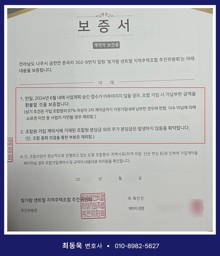 겉으로 보기에는 조합원의 원금을 보호하는 장치처럼 보이지만, 실제로는 적법한 총회 결의 없이 발급된 문서로서 법적 효력이 인정되지 않는 경우가 대부분입니다.