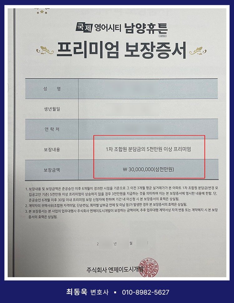뿐만 아니라 해당 사업장은 분양가 대비 5,000만 원의 프리미엄을 보장한다는 내용의 법적 근거가 부족한 ‘프리미엄 보장증서’도 함께 발급된 사실이 확인되어, 최동욱 변호사는 위와 같은 사정을 종합적으로 검토한 후, 의뢰인들이 계약취소 및 납입금 반환을 청구할 수 있는 충분한 법적 근거가 있다고 판단하였습니다.