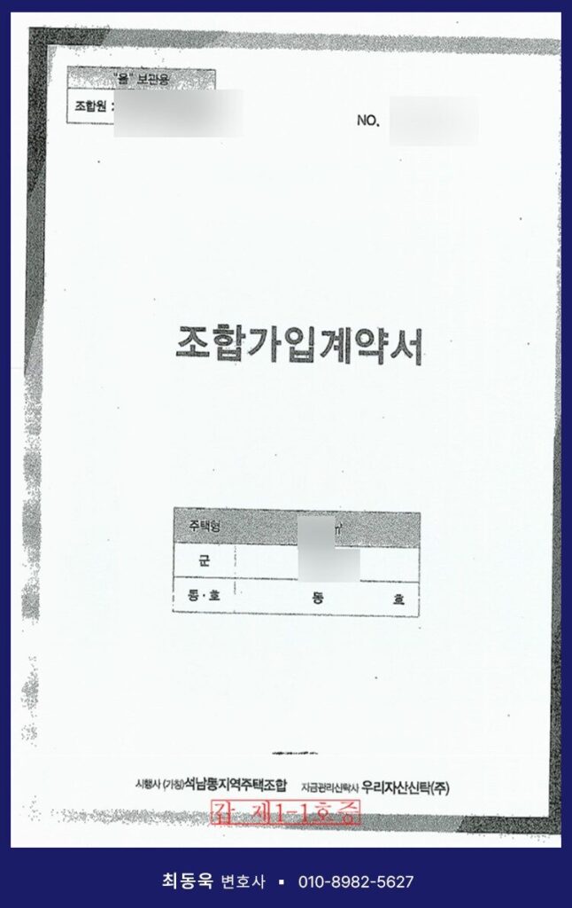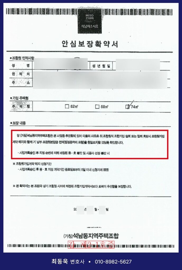 소송을 위임하신 의뢰인 두 분(정○○ 님 외 1인)은 2020년경 석남동 지역주택조합과 아파트 1세대를 공급받는 내용의 가입계약을 체결하신 후, 각 5천만 원을 분담금으로 납입하셨습니다. 해당 사업장은 당시 전국 다수의 지역주택조합 사업장에서 문제 되었던 이른바 ‘안심보장증서’를 교부한 현장으로, 해당 문서에는 「안심보장확약서」라는 제목 아래 ‘사업계획승인 이후 지정 순번에 따라 배정된 동·호수에 불만이 있거나 시공사 선정에 대한 불만이 있을 경우, 분담금 전액을 환불한다’는 내용이 기재되어 있었습니다.