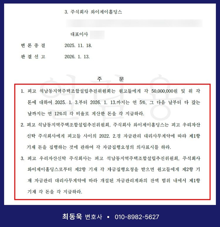 이에 사건을 심리한 인천지방법원은 최동욱 변호사의 주장을 모두 받아들여, 석남동 지역주택조합이 의뢰인들에게 납입금 전액을 반환하라는 판결을 선고함과 동시에, 신탁사(우리자산신탁)가 판결금을 즉시 반환할 수 있도록 조합과 업무대행사가 신탁사에 자금집행요청의 의사표시를 하라는 판결까지 함께 선고하였습니다.