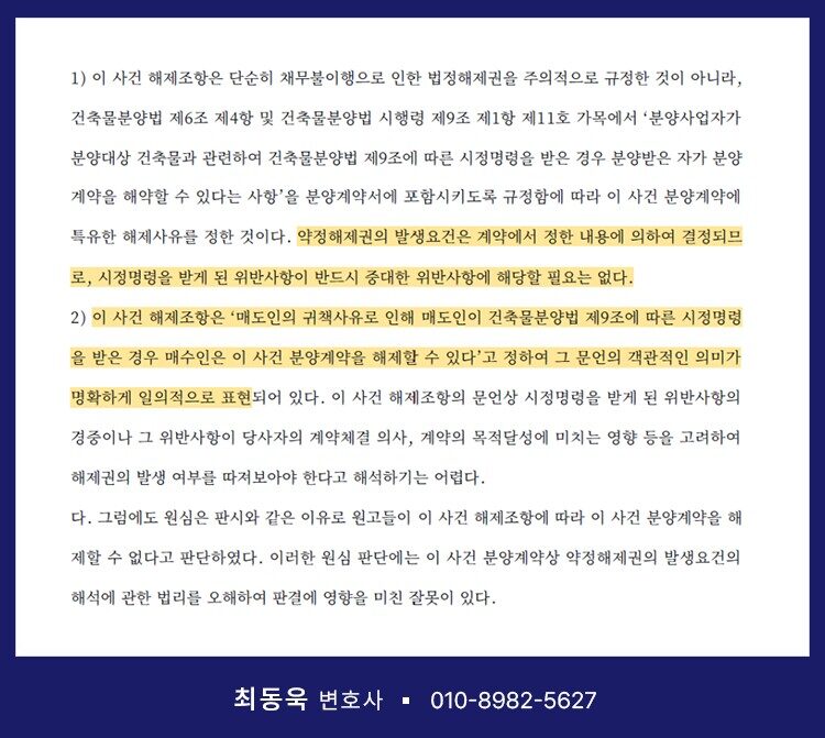 이 판결은 “통보받은 시정명령의 내용이 계약의 목적을 달성할 수 없을 정도로 <중대한 위반>에 해당하는지”를 살펴보던 기존 하급심 판결과 달리, “처분의 경중과 관계없이, 계약서상 해제 사유에 해당한다면 분양계약을 해제할 수 있다”고 판시한 것이기 때문에 분양계약 해지를 고민하는 수분양자들께서는