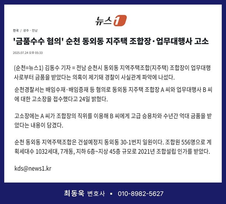 더 나아가 최근에는 조합장이 업무대행사로부터 금품을 수수했다는 의혹이 제기되어 경찰 수사가 진행되는 등, 새로운 의혹과 분쟁까지 이어지고 있는 상황입니다. 이러한 일련의 사정으로 인해 다수의 조합원분들께서 조합 탈퇴 및 계약 해지를 검토하시며, 저희 법인을 통해 관련 법률상담을 진행하고 계십니다.