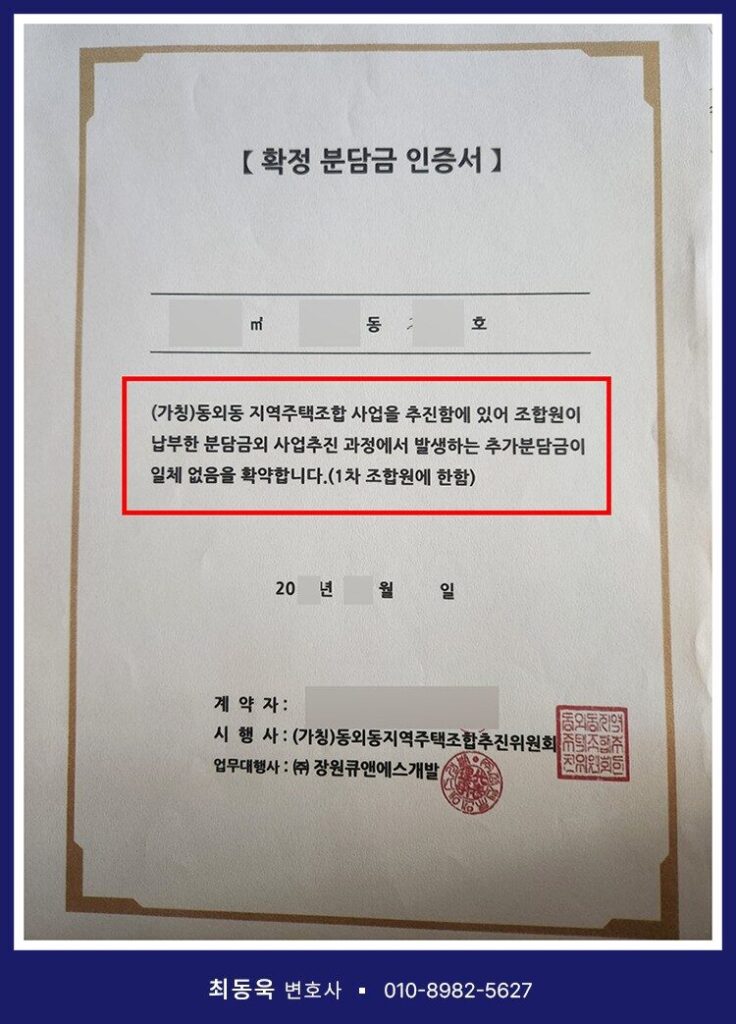 “본 사업을 추진함에 있어 이미 납부한 분담금 외에, 사업 추진 과정에서 발생하는 추가 분담금은 일체 없음을 확약합니다”라는 내용이 기재된 이른바 「확정 분담금 인증서」를 교부한 사실이 확인됩니다.