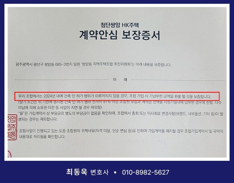 검토 결과, 의뢰인은 계약 당시 “2024년 내에 건축 인·허가 절차가 이루어지지 않을 경우 조합 가입 시 납부한 금액을 환불할 것을 보증한다”는 내용이 기재된 <계약안심보장증서>를 발급받은 상태였습니다. 표면적으로 보면 원금 반환이 보장되는 안전한 사업처럼 보일 수 있지만, 실제로는 이러한 문서가 적법한 총회 결의 절차를 거치지 않은 경우가 많아 다수의 법원에서 효력이 인정되지 않는 무효 문서로 판단된 바 있습니다.
