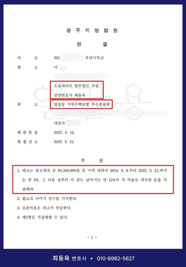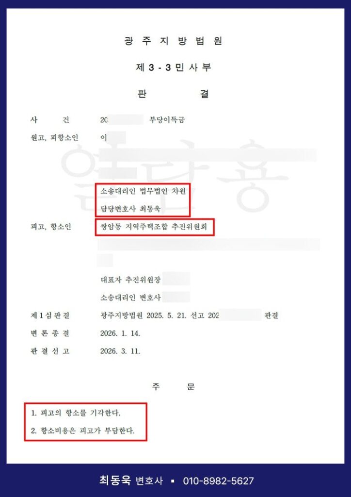 그 결과 광주지방법원은 쌍암동 지역주택조합이 의뢰인에게 납입받은 원금 6,030만 원과 이에 대한 지연이자를 반환하라는 취지의 승소 판결을 선고하였습니다. 이후 조합 측이 판결에 불복하여 항소를 제기하였으나, 항소심 법원 역시 해당 문서의 법적 효력에 문제가 있음을 인정하며 1심 판단이 정당하다고 보았습니다. 이에 따라 2심에서도 의뢰인 승소 판결이 그대로 유지되었습니다.
