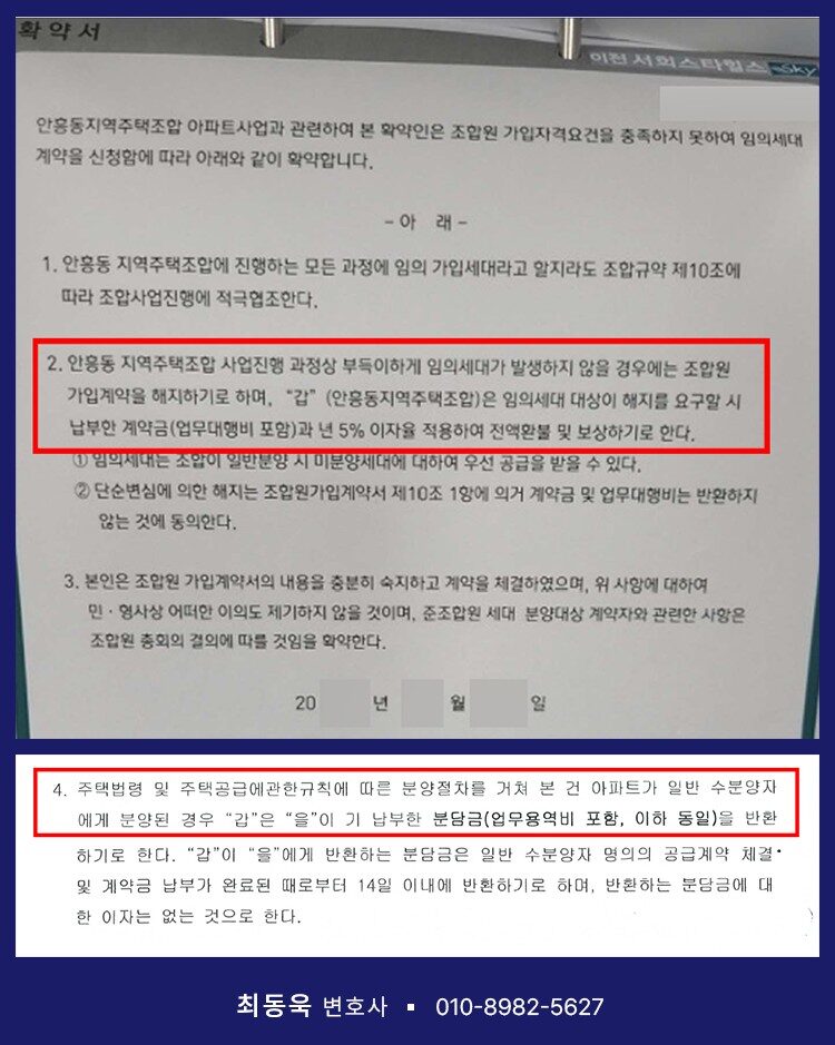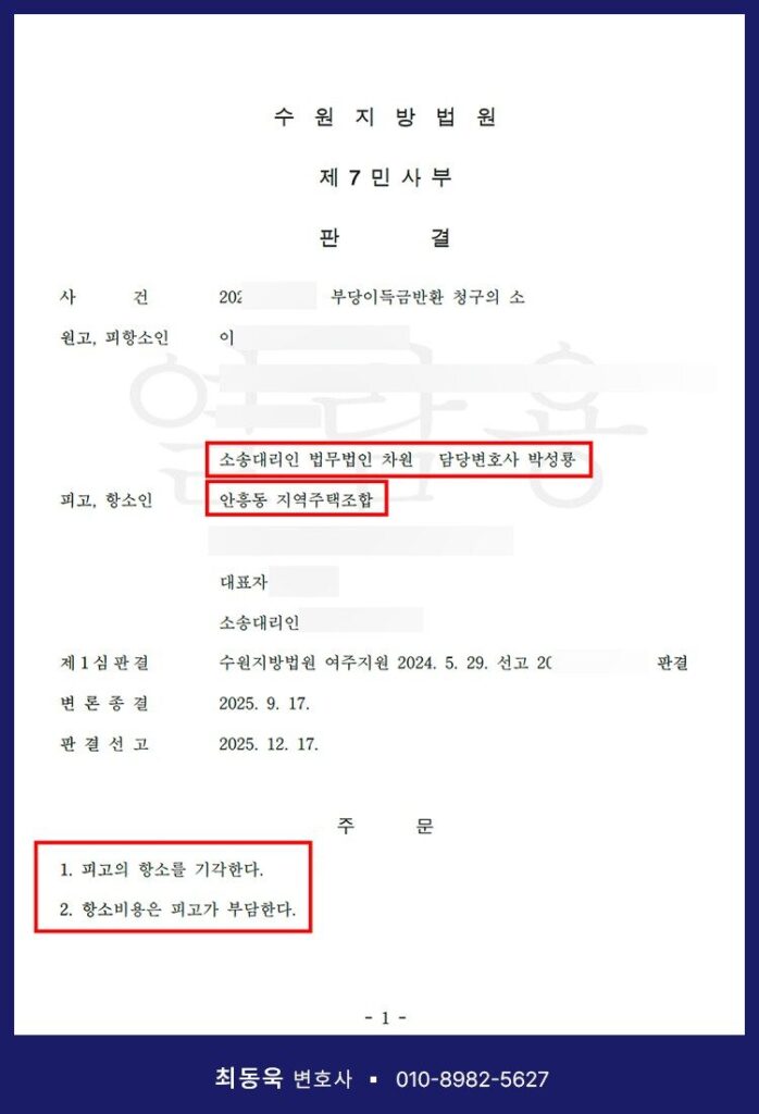 이러한 승소 사례가 알려지면서 최근에도 관련 법률상담 문의가 지속적으로 이어지고 있는데, 그 과정에서 최동욱 변호사는 또 다른 의뢰인을 대리하여 안흥동 지역주택조합을 상대로 소송을 제기하였고, 다시 한 번 전액승소 판결을 이끌어냈습니다.