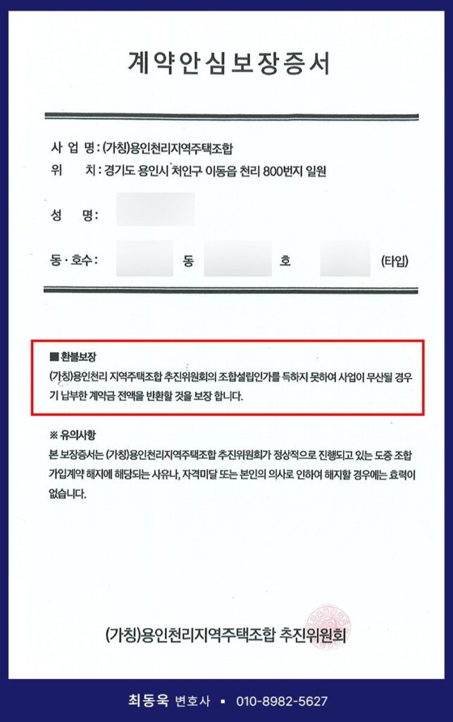 “(가칭)용인천리 지역주택조합 추진위원회의 설립 인가를 득하지 못하여 사업이 무산될 경우, 기 납부한 계약금 전액을 반환할 것을 보장합니다.”