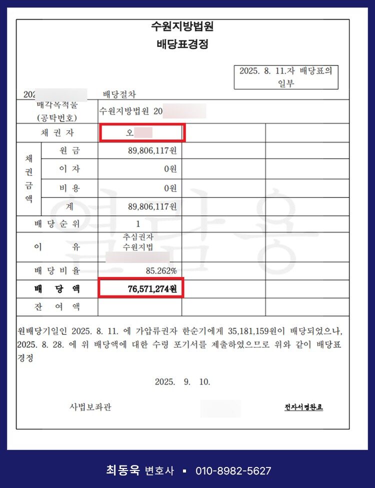 이후 최동욱 변호사는 단순한 판결에 그치지 않고, 조합의 재산을 신속히 파악하여 강제집행 절차를 진행, 그 결과 법원의 배당을 통해 총 7,650만 원을 실제로 회수하는 데 성공하였습니다.