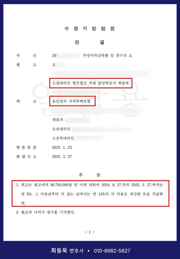 수원지방법원은 최동욱 변호사의 주장을 받아들여, 조합이 의뢰인에게 납입한 분담금 전액(업무대행비 포함) 8,670만 원 및 이에 대한 지연이자를 반환하라는 전액 승소 판결을 선고하였습니다.