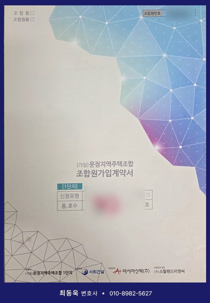 의뢰인(이00 님)께서는 2016년 운정지역주택조합에 가입하신 조합원으로, 이후 약 9년 이상 사업이 지체되는 상황을 지켜보시면서 다수의 다른 조합원들이 탈퇴하는 모습을 접하게 되었습니다. 이러한 과정에서 사업 전반에 대한 신뢰를 상실하게 되었고, 결국 최동욱 변호사와의 법률상담을 통해 계약관계 전반을 검토하시게 되었습니다.